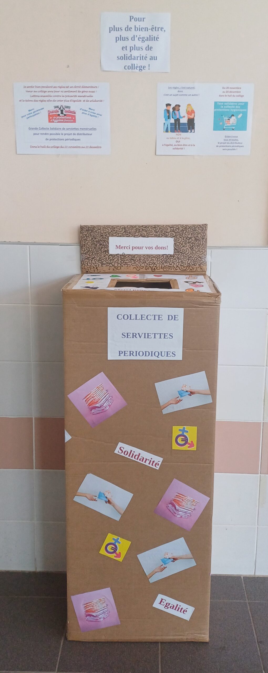 Du 20 novembre au 20 décembre, une boite décorée par les élèves du Conseil de Vie Collégienne se trouve dans le hall du collège pour recevoir vos dons de paquets de serviettes menstruelles. Cette collecte, qui a lieu dans le prolongement d’une séance de sensibilisation de toutes les classes à la thématique des règles dans le cadre du CESCE, a pour objectif de lutter contre la précarité menstruelle et de montrer, au-delà des tabous, que le bien-être des jeunes filles au collège est l’affaire de tous et toutes.
