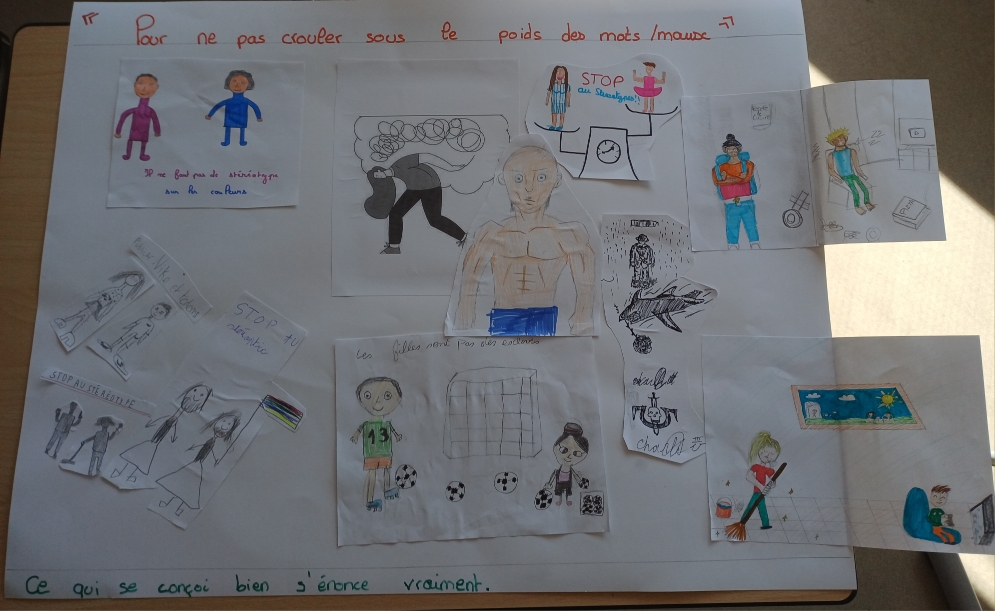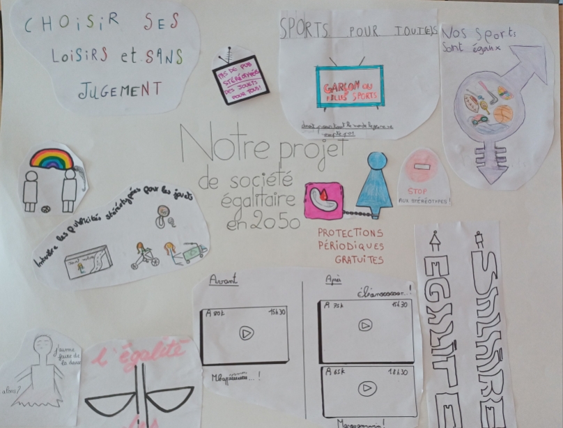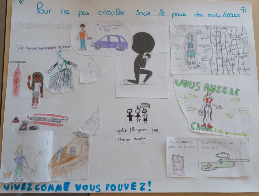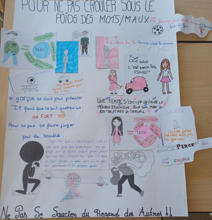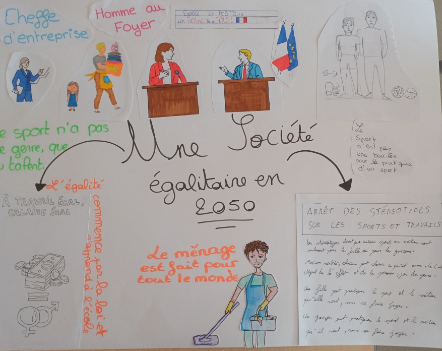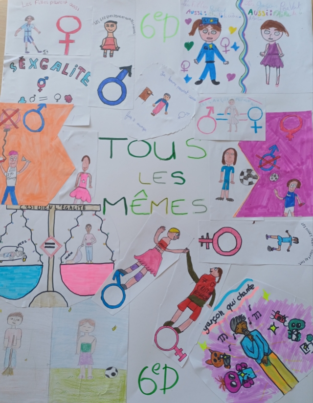 L’identification des stéréotypes pour les 6èmes, la compréhension des conséquences des stéréotypes omniprésents dans la société pour les 5èmes, la lutte contre les violences sexistes et la connaissance de la lente conquête des droits des femmes pour les 4èmes, ou bien les inégalités dans le domaine professionnel et l’imagination d’une société plus égalitaire pour les 3èmes : les thèmes de réflexion et de création ont été nombreux, tout comme les travaux produits !