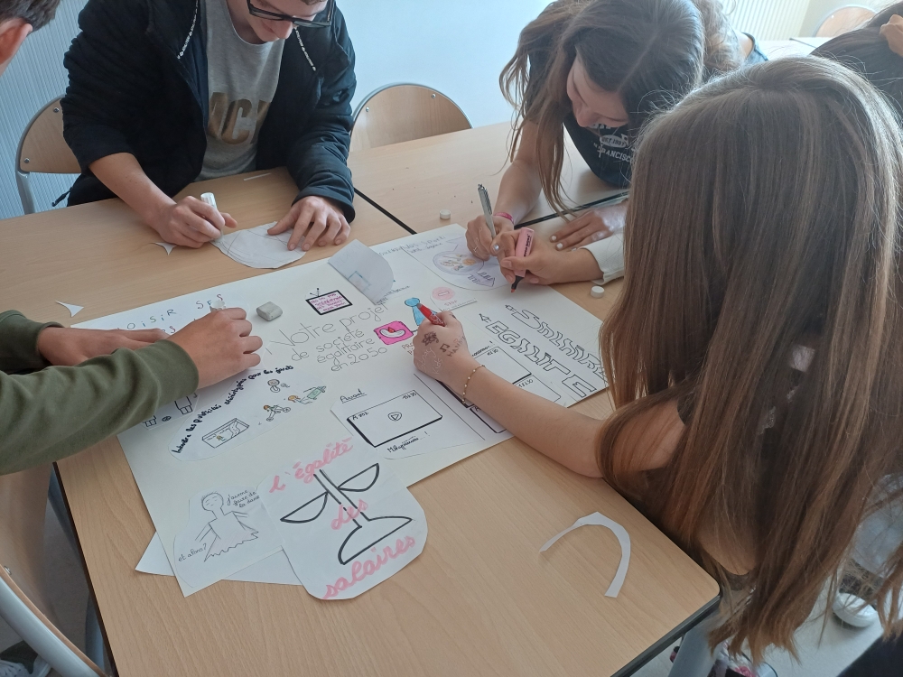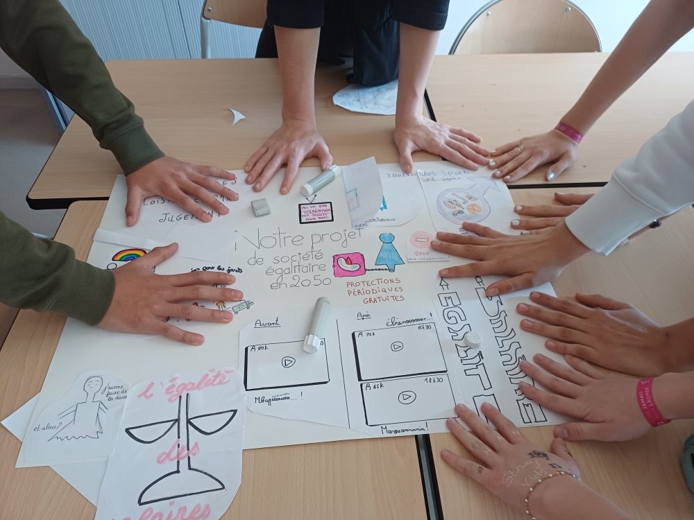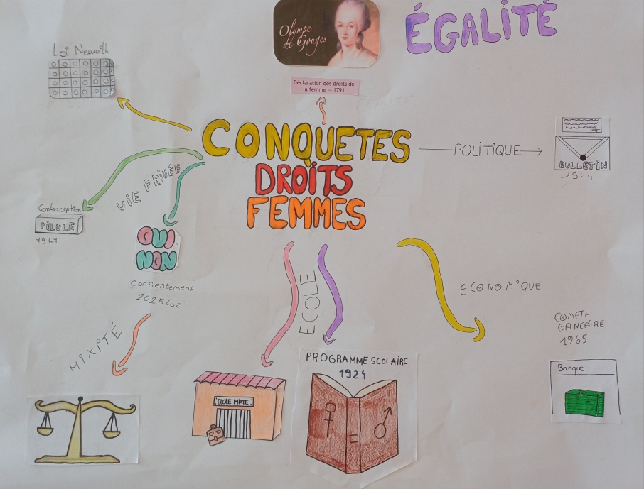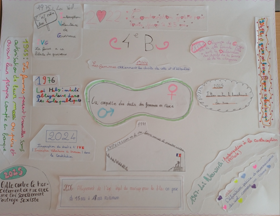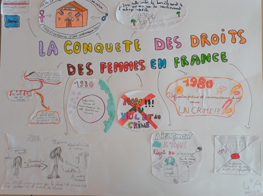 L’identification des stéréotypes pour les 6èmes, la compréhension des conséquences des stéréotypes omniprésents dans la société pour les 5èmes, la lutte contre les violences sexistes et la connaissance de la lente conquête des droits des femmes pour les 4èmes, ou bien les inégalités dans le domaine professionnel et l’imagination d’une société plus égalitaire pour les 3èmes : les thèmes de réflexion et de création ont été nombreux, tout comme les travaux produits !