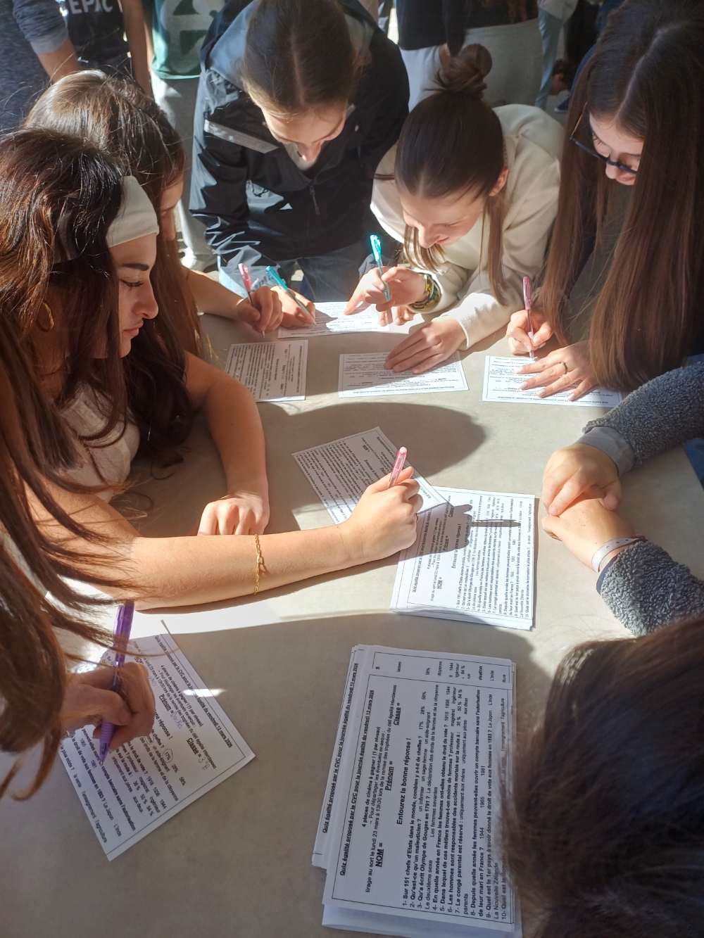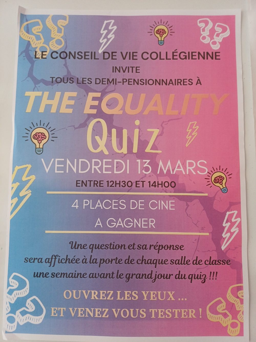 Puis, sur le temps de la pause méridienne, les élèves du Conseil de Vie Collégienne ont proposé à tous leurs camarades un quiz égalité. 10 questions et 4 places de cinéma à gagner ! La participation a été nombreuse et joyeuse : 147 élèves ont ainsi tenté leur chance !