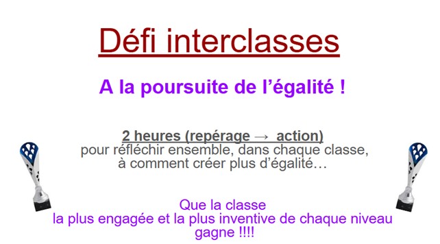 Et les élèves, qu’ont-ils pensé de ce défi égalité ? Interviewés par leur enseignante d’EMC, Mme Braun, garçons et filles ont apprécié ce temps de réflexion collective, car ils ont pris conscience de plein de choses ! Ecoutons ces témoignages de 5ème E :