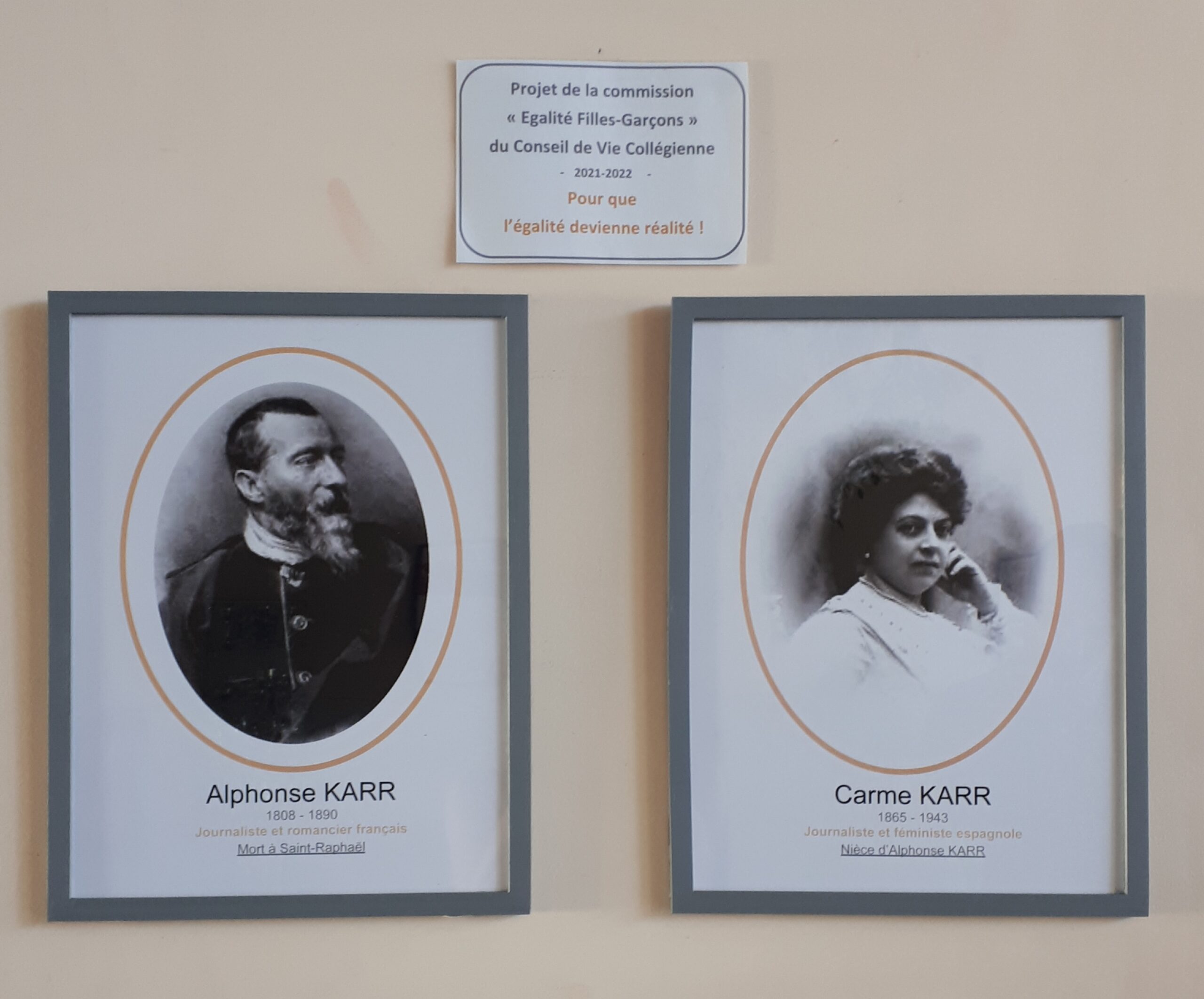- « Je pense que le simple fait d’afficher Carme Karr dans le collège peut changer quelque chose dans le combat que nous menons pour qu’il y ait plus d’égalité et moins de stéréotypes. » Elyna R. 3ème