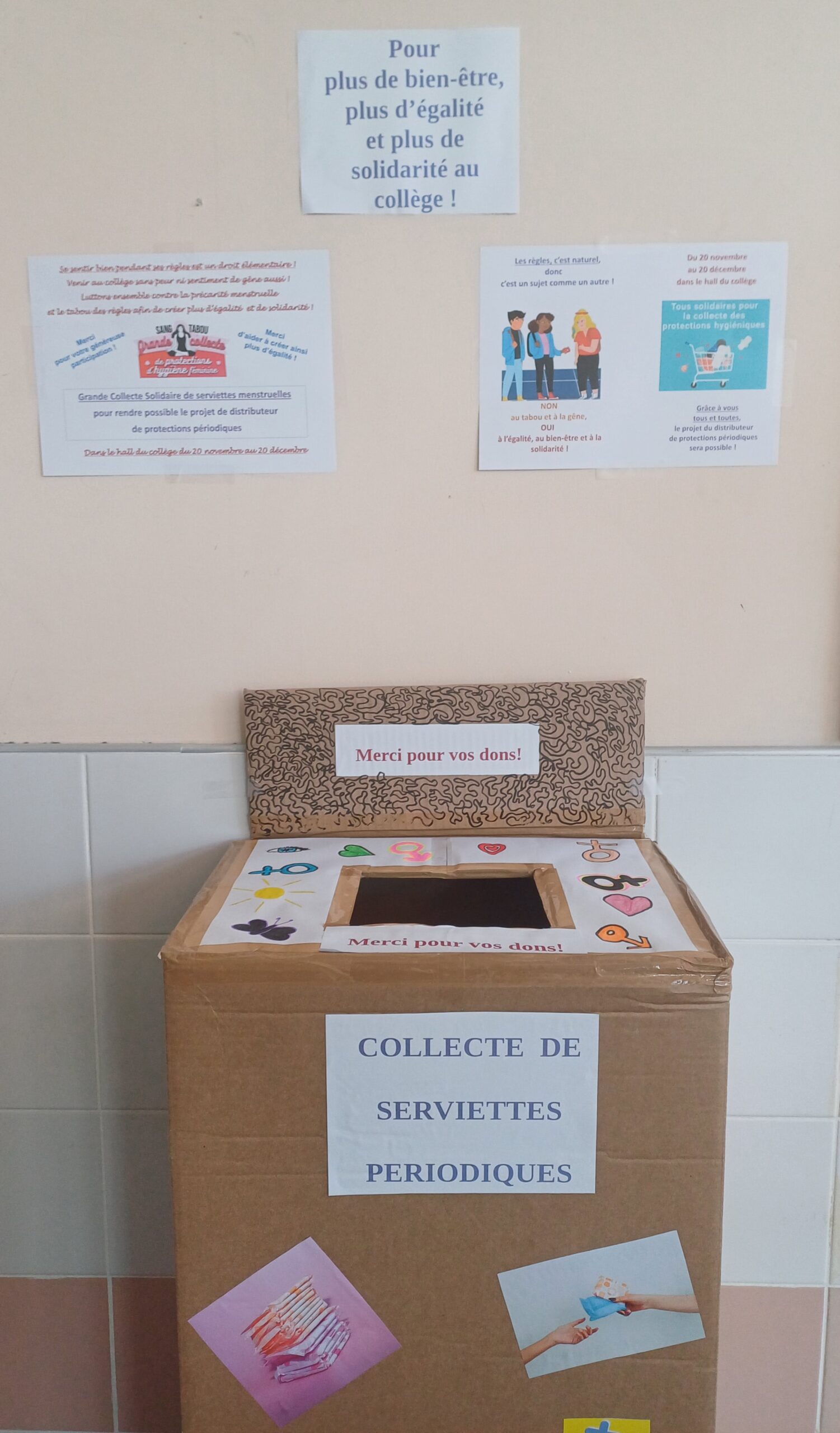 Le mois de novembre vient de s’écouler et il fut marqué au collège par la solidarité ! Comme chaque année la collecte solidaire de protections périodiques pour alimenter les 2 distributeurs du collège a eu lieu après avoir sensibilisé toutes les classes de 6èmes à la puberté et à la santé menstruelle, pour lutter contre les tabous (1ère séance d’EVARS en 6ème)