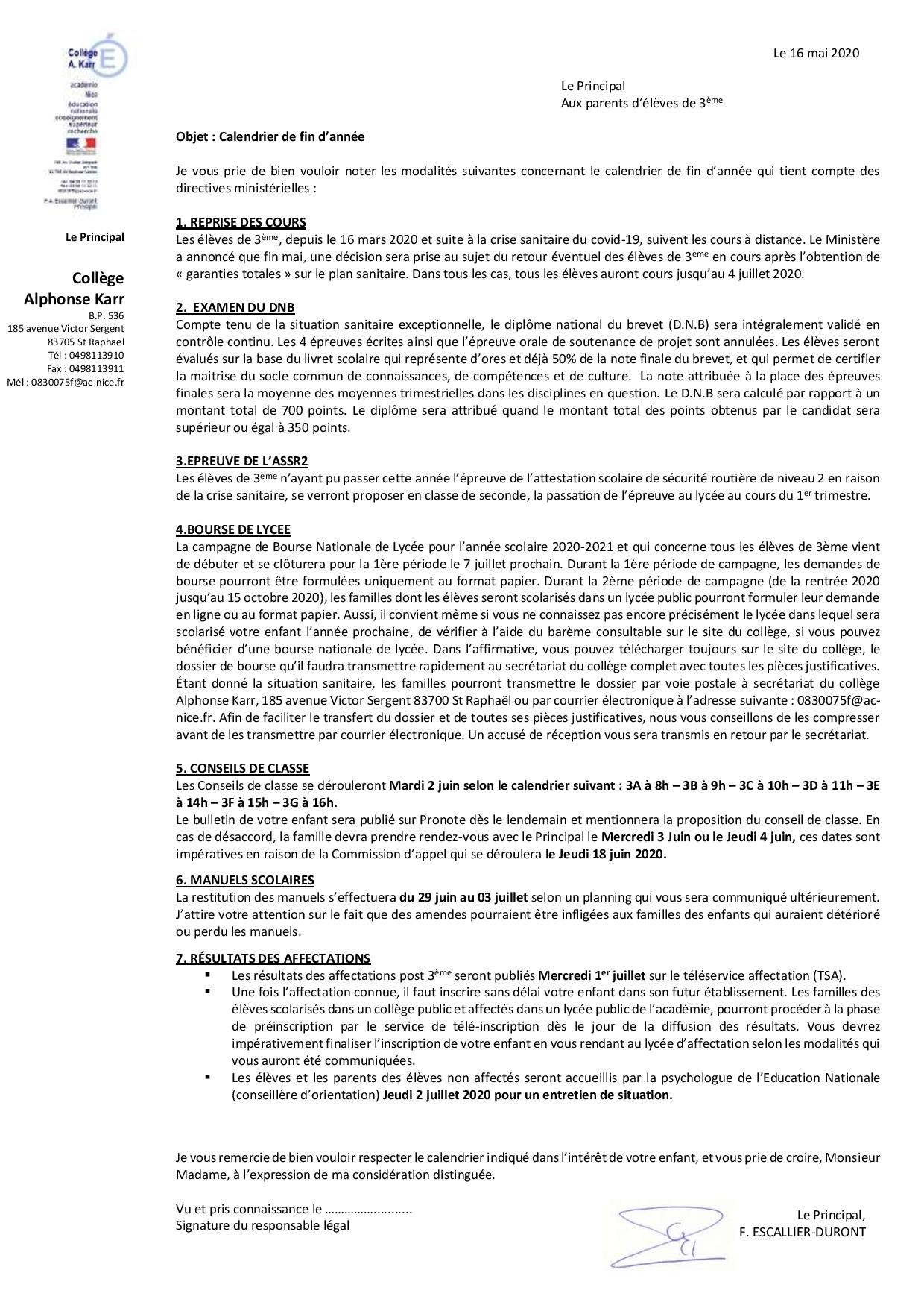 Dossier d’inscription au collège Alphonse Karr pour l’année scolaire 2020 – 2021
